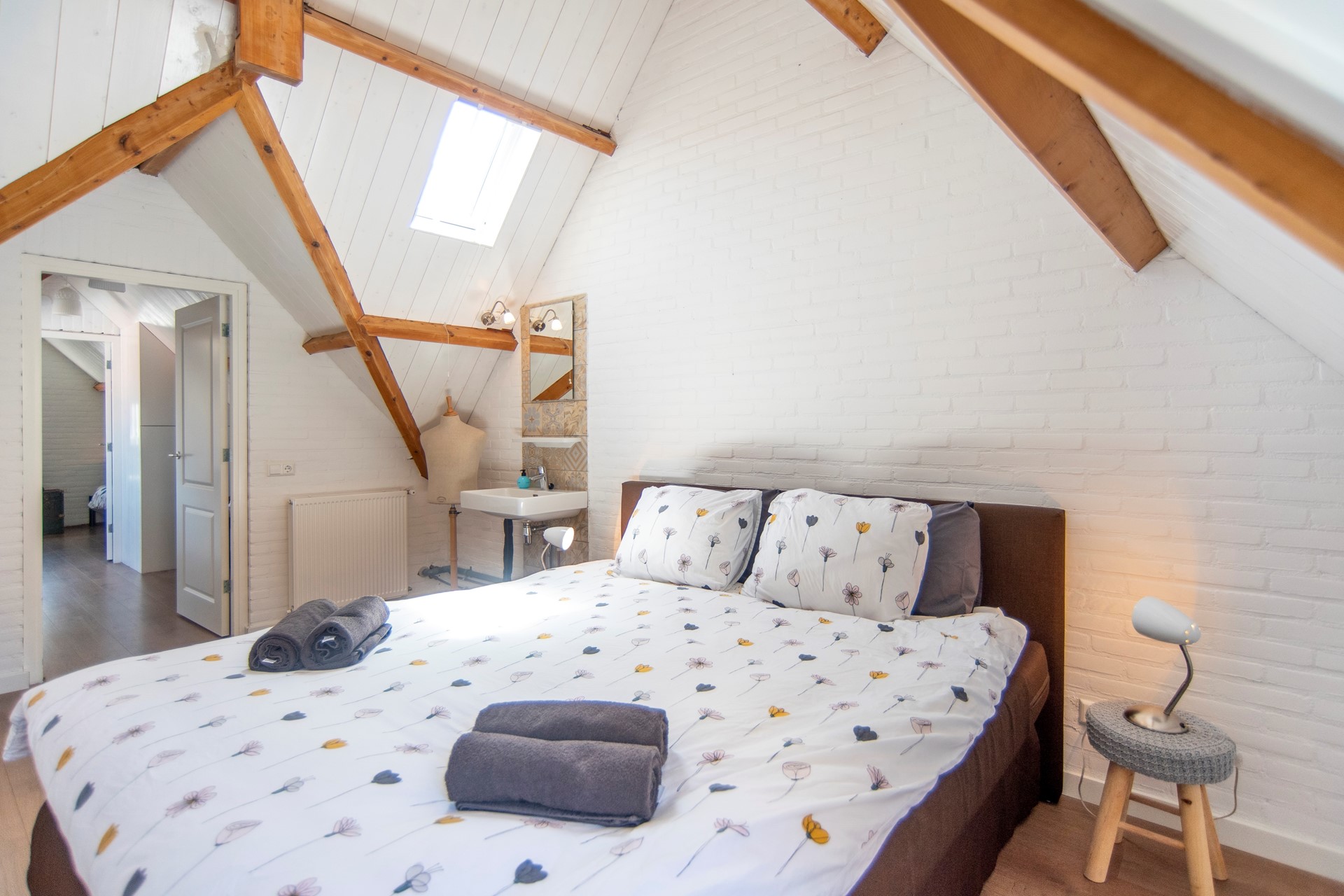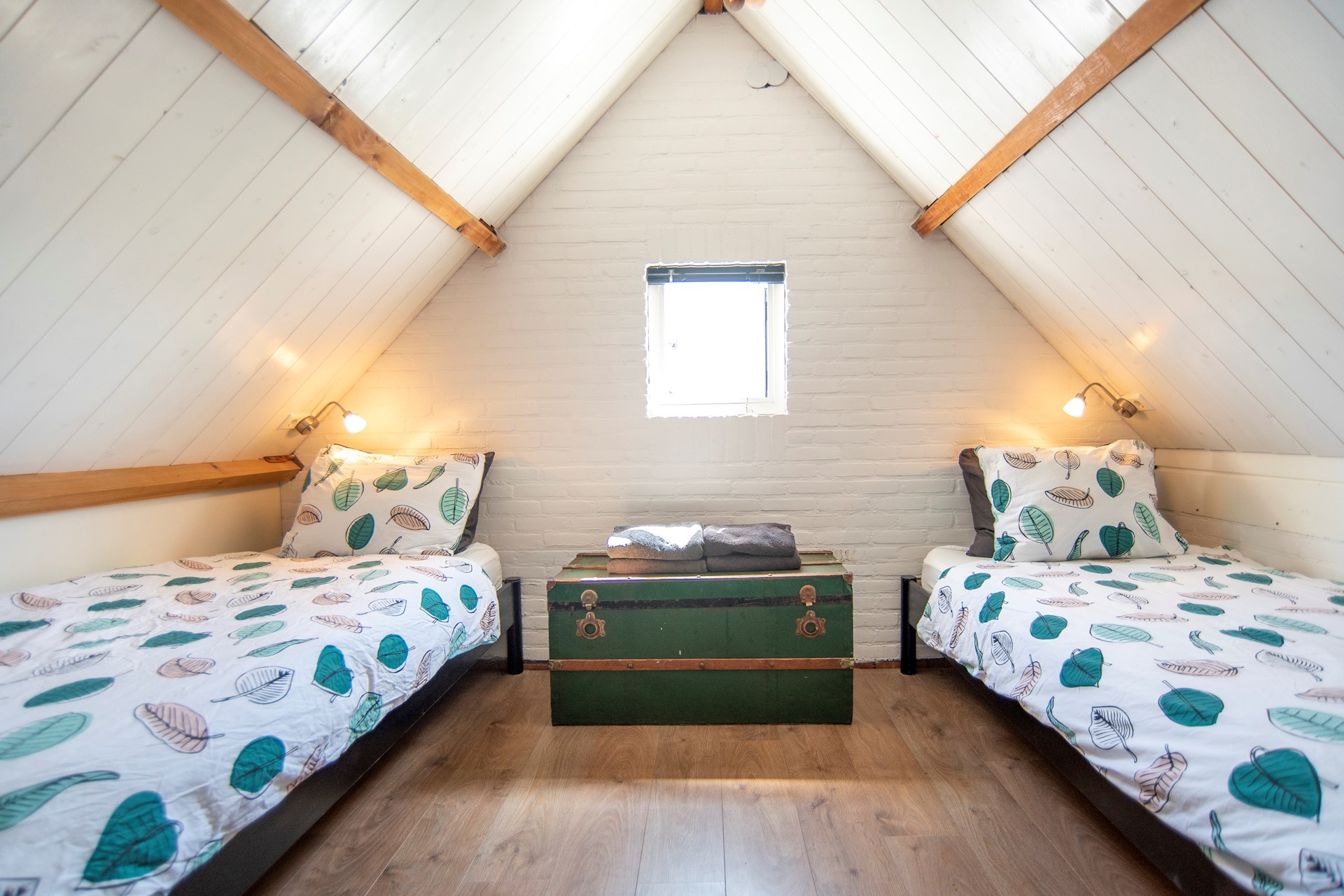 Via een trap bereik je de bovenverdieping met twee slaapkamers: één met een comfortabel tweepersoonsbed en één met twee aparte bedden.