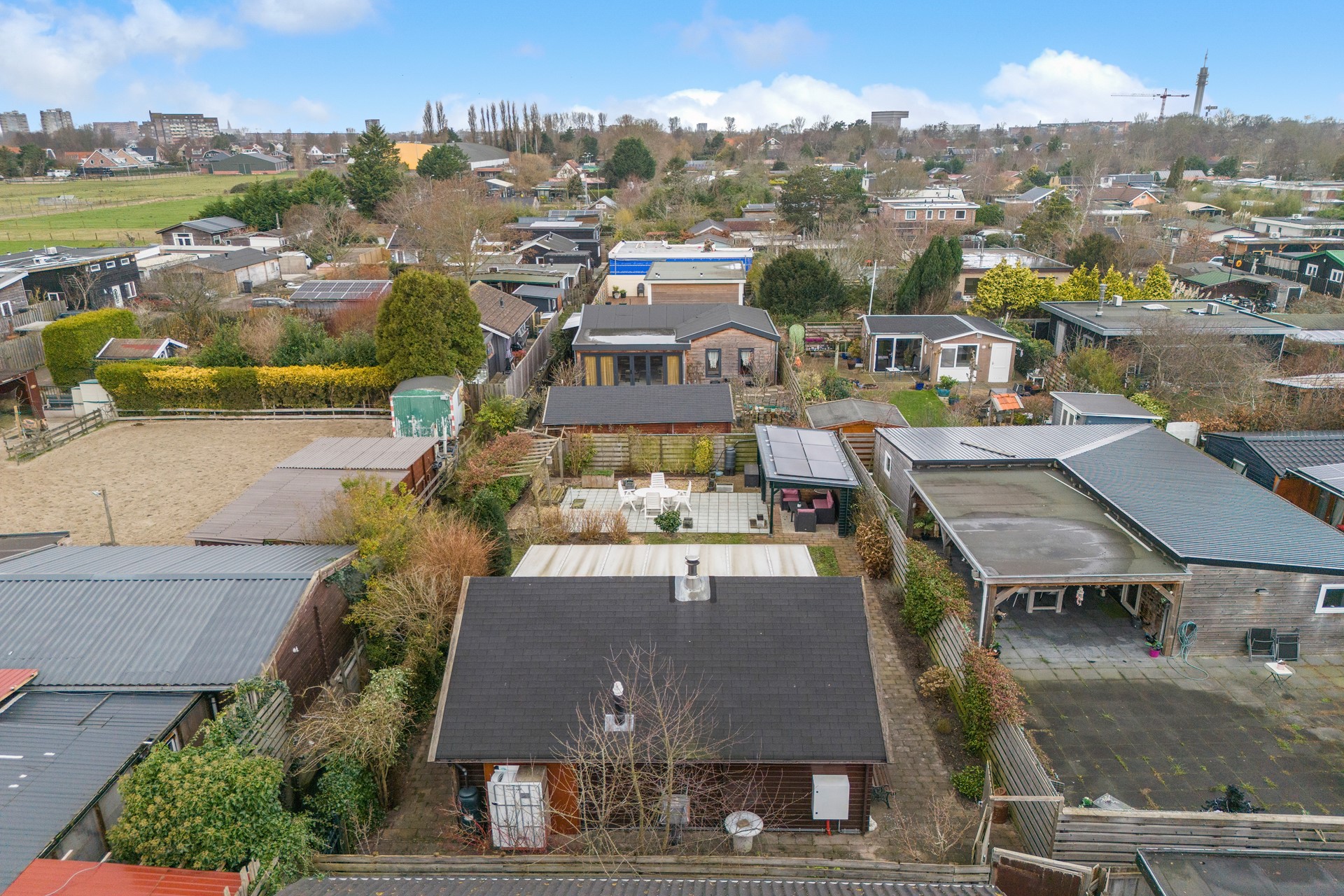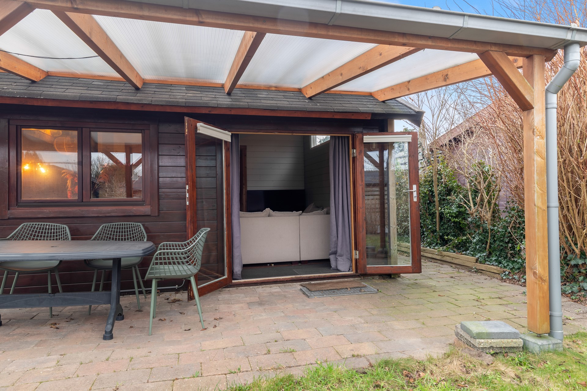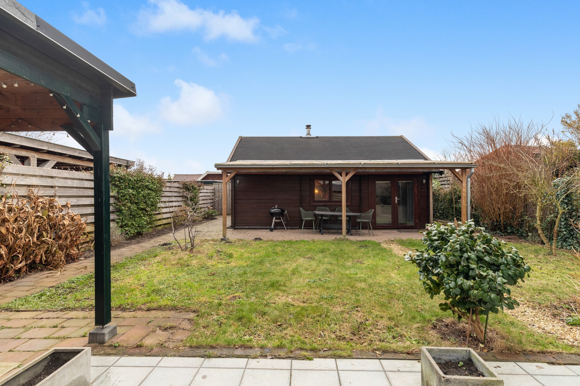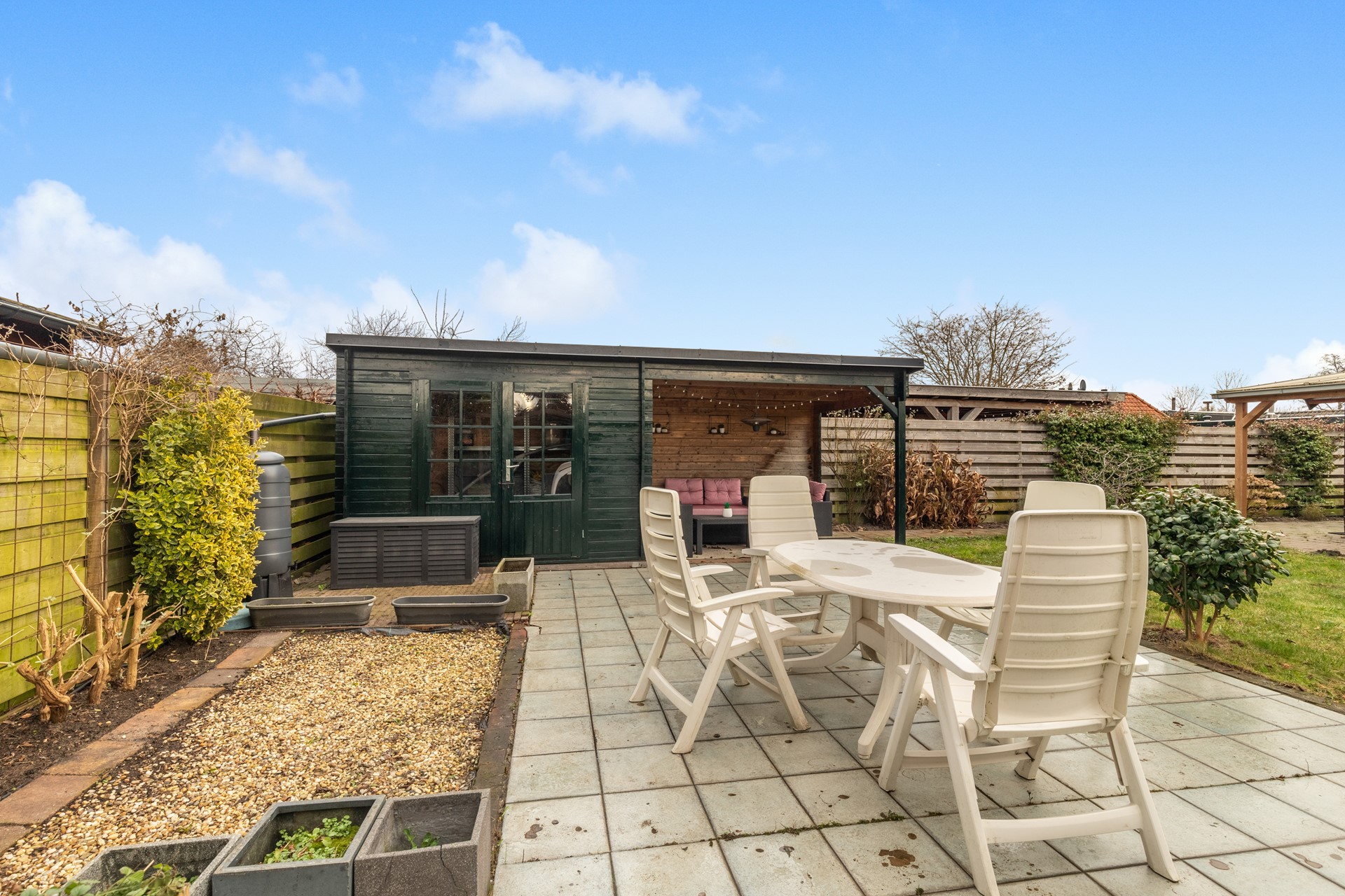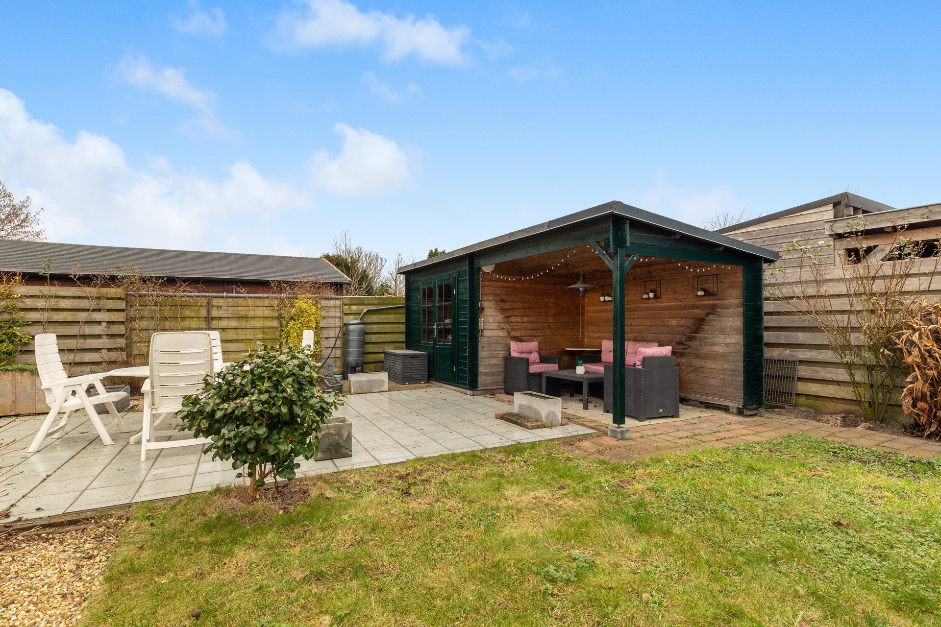 Achterin de tuin bevindt zich een ruime schuur met een gezellige overdekte zithoek: een heerlijke plek voor lange zomeravonden of als beschutte lounge in het voor- en najaar.