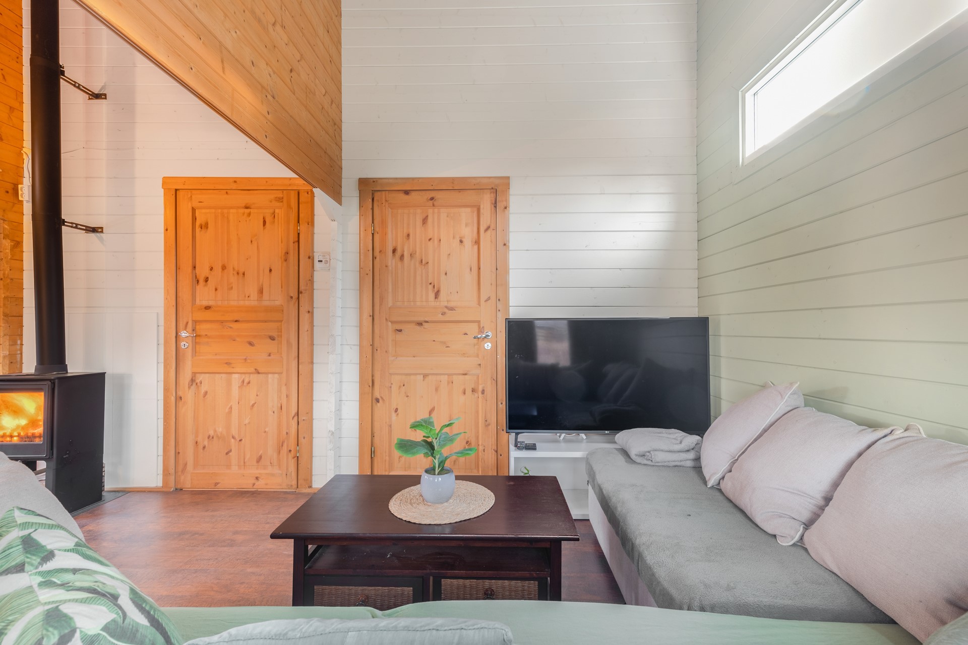 - sfeervolle woonkamer met openslaande deuren en houtkachel;